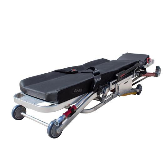Hospital Chair Stretcher / Automatic Loading / Black Premium quality material Made of high strength coated aluminium alloyed body and cover coated cushion surface. Easy manhandling mechanism. The Legs are controlled by handles on both sides. can be secured...